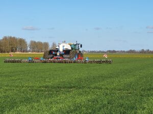 Sinds 2025 rijden wij met een Duport Liqiliser van 15 meter breed in combinatie met een schuif-as onder de tank op grote lage druk banden met een luchtdrukwisselsysteem