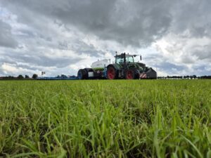 Het toedienen van vloeibare meststoffen wordt gedaan met een 15 meter brede spaakwielbemester. De bemester is voorzien van GPS aangestuurde sectieafsluiting met 9 secties. Op deze manier kunnen wij met minimale overlap uw gras, graan of bouwland voorzien van vloeibare meststoffen. Tevens is het sinds 2025 ook mogelijk om op taakkaart te bemesten, wat mee zou kunnen tellen voor GLB